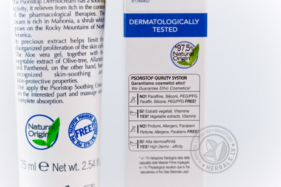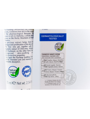 Psoristop krēmam piemīt nomierinošas un niezi mazinošas īpašības. Šis krēms ir bagātināts ar mahonijas (Mahonia aquifolium) ekstraktu. Daudzos gadus mahonijas ekstrakts tiek izmantots tautas medicīnā kā dažādu ādas slimību ārstēšanas līdzeklis. Šampūni, krēmi un mazgāšanās putas, kuri tika izgatavoti uz mahonijas ekstrakta bāzes, mūsdienās tiek lietoti kosmētiskai ādas kopšanai ekzēmas, psoriāzes un ļoti jūtīgas ādas gadījumos.