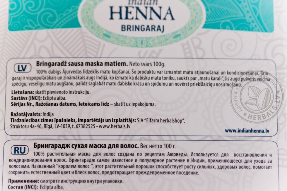 Sastāvs: Bringaraj (eclipta alba) lapu pulveris.