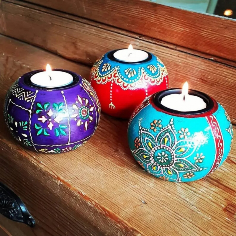 Radžastānas tuksneši vienmēr ir iedvesmojuši pārsteidzošus krāsainus amatniecības darbus un sarežģītas detaļas. Šie skaistie sveces turētāji ir ar rokām izgatavoti Džodhpurā, Radžastānā.