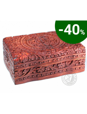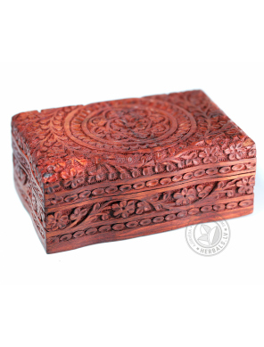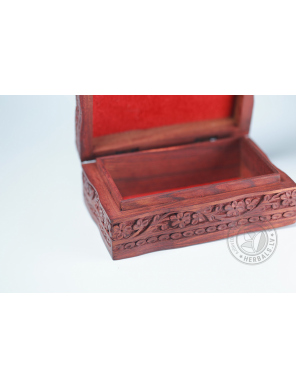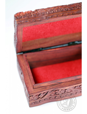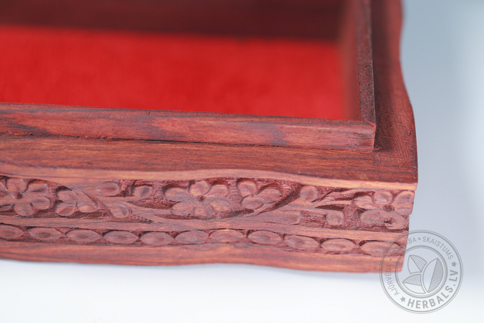 Šī unikālā kastīte izceļas ar rūpīgu roku darbu un dizainu. Koka grebums rada izsmalcinātus rakstus.