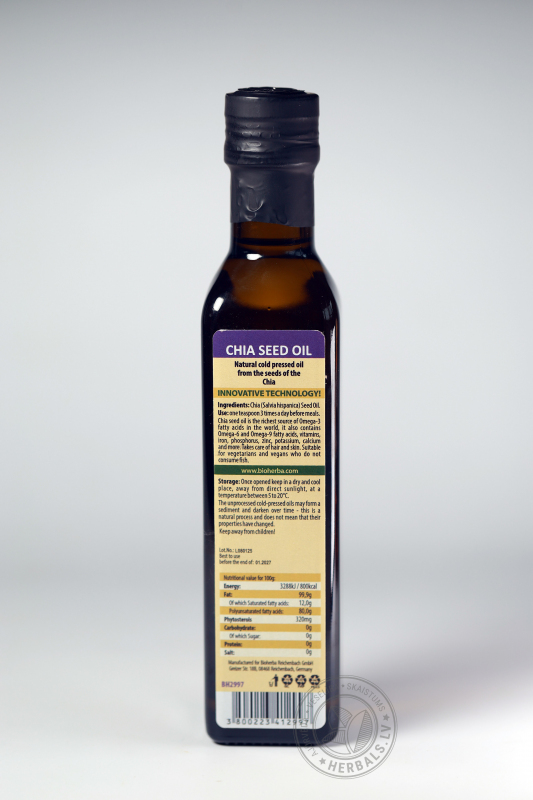Čia sēklu eļļa ir bagātīgs Omega-3 taukskābju avots, tajā ir arī Omega-6 un Omega-9 taukskābes, vitamīni, dzelzs, fosfors, cinks, kālijs, kalcijs u.c. Eļļa palīdz samazināt holesterīna līmeni asinīs, samazina artēriju sieniņu iekaisuma risku un palīdz regulēt cukura līmeni asinīs. Rūpējas par veseliem matiem un ādu. Piemērots veģetāriešiem un vegāniem, kuri atteikušies no zivīm.