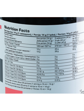 Vidējas ķēdes taukskābes. Tā ir tauku forma, kuru organisms ļoti ātri un efektīvi “sadedzina”, lai iegūtu enerģiju. Lietojot ikdienas uzturā, tā palīdz palielināt izturību, spēku un muskuļu masu. Šī eļļa satur tikai vidējas ķēdes taukskābes, kas satur 2 reizes vairāk enerģijas nekā ogļhidrāti un olbaltumvielas.