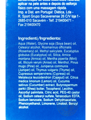 Aqua (ūdens), Glycine soja (sojas pupu) eļļa, cetearilspirts, Rosmarinus officinalis (rozmarīns) eļļa, metilsalicilāts, Eucalyptus globulus (Eucalyptus) eļļa, silīcija dioksīds, Arnica montana (Arnica) eļļa, Mentha piperita (Mint) eļļa, Illicium sēklu eļļa, Melaleuca leucodendron (Cajeput) eļļa, Citrus medica limonum (Citrona) eļļa, Citrus medica limonum (citrona eļļa), Etiķa eļļa, Mentols, Pinus mugo (Pine) eļļa, Juniperus communis (Kadagļu eļļa), Thymus vulgaris eļļa, Cupressus sempervirens Cucumis sativus ekstrakts, Butyrospermum parkii (Shea) sviests, Tocopherol, lecitīns, askorbilpalmitāts, citronskābe, PEG-40 rīcineļļa, nātrija ctearilsulfāts, tetranātrija EDTA, nātrija benzoāts, fenoksietanols, dehidrokietiķskābe, limonēns, linalools, Benzilskābe.