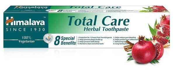 Himalaya Total Care Herbal Zobu pasta ir uzlabota augu formula, kas nodrošina 12 stundu aizsardzību pret kaitīgiem mikrobiem, palīdz cīnīties ar smaganu asiņošanu un aplikuma veidošanos. Atsvaidzinoša garša.