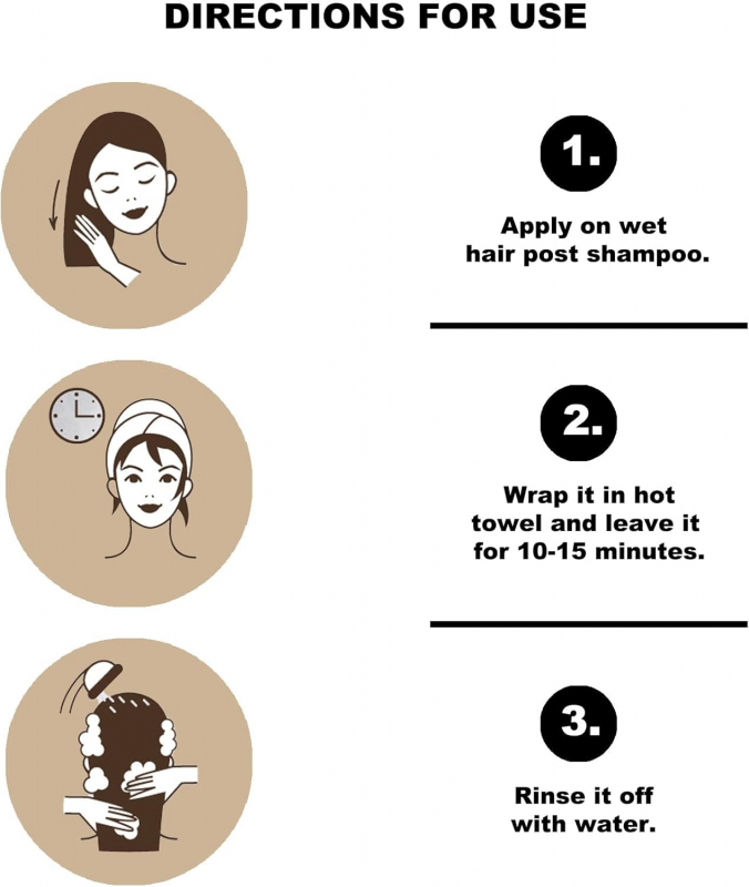 Lietošana: plaukstas apjoma daudzumu iemesējiet matos, ietiniet dvielī un paturiet 15 minūtes. Pēc tam izskalojeit ar ūdeni. Lietot vienu reizi nedēļā.