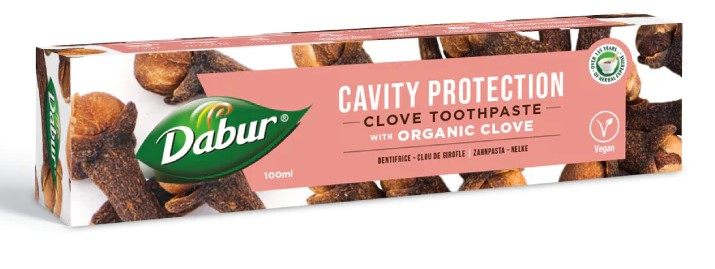 Dabur Clove organiskā krustnagliņu zobu pasta ir unikāls dabisko sastāvdaļu maisījums un spēcīgs tādu sastāvdaļu maisījums kā krustnagliņa, Jamun Bark un Pellitori. Plaši zināms, ka krustnagliņas ir piemērotas jutīgiem zobiem. Dabur Clove zobu pasta ar organiskām krustnagliņām ir piemērota jutīgiem zobiem, aizsargā smaganas un palīdz novērst kariesu veidošanos.