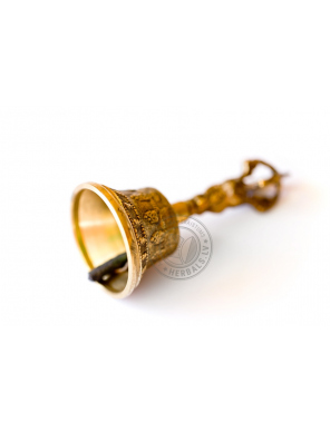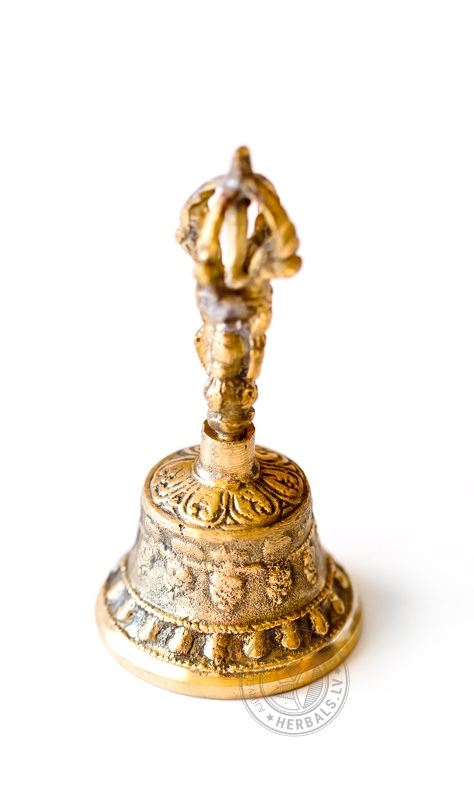 To tur kreisā rokā, bet vadžru labajā. Zvaniņu grezo skaisti griezumi metālā, ērts rokturītis un dievišķību attēli aizsardzībai.