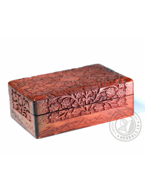 This unique box stands out for its meticulous handcrafting and design. Wood carving creates sophisticated patterns. The inside of the box is soft velvet, burgundy color.