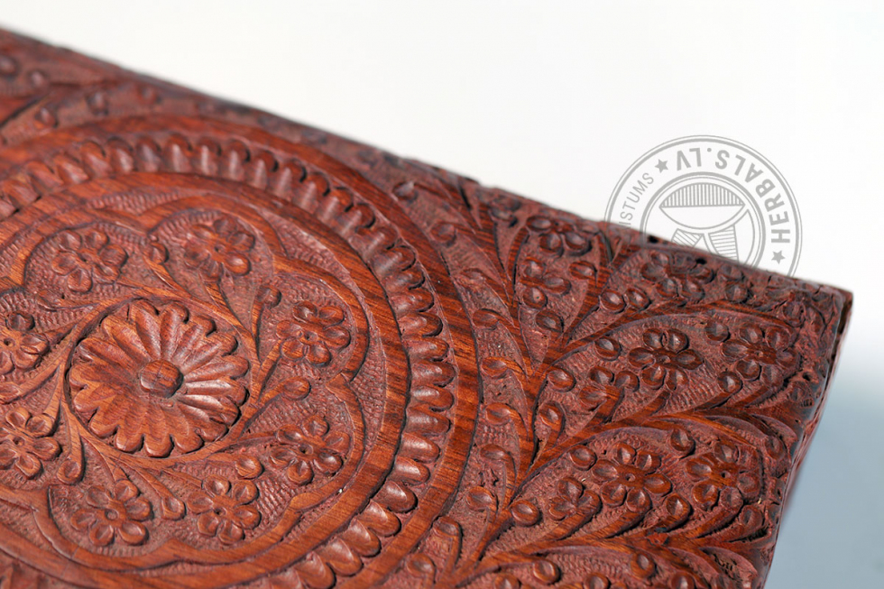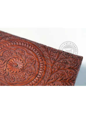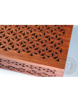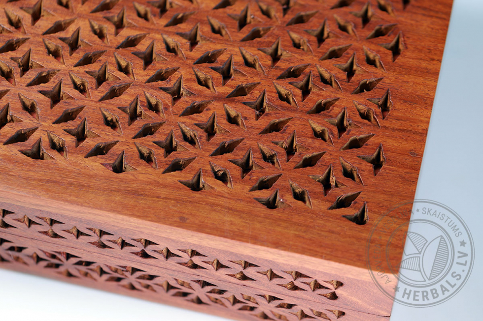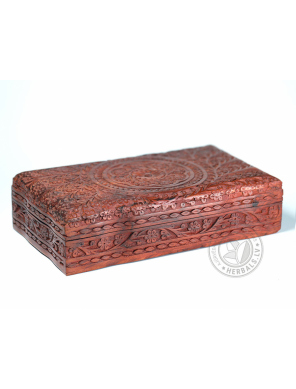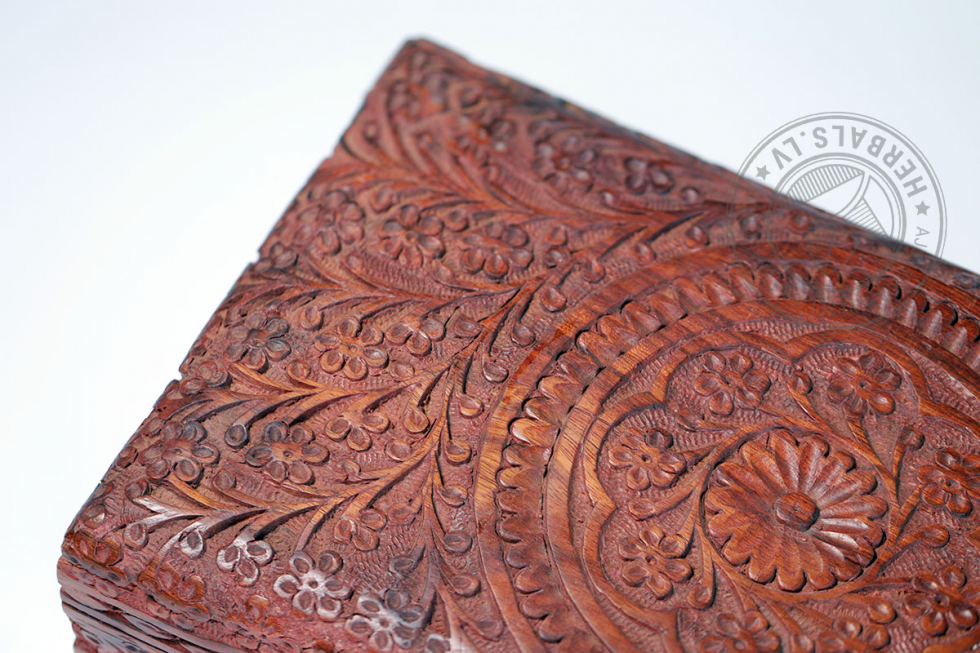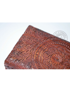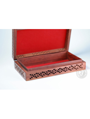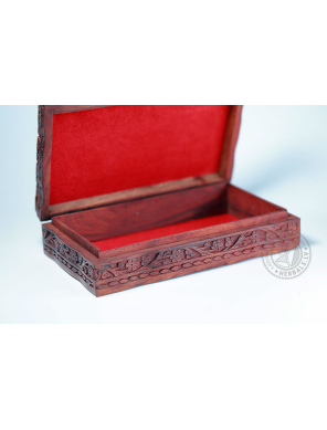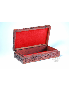 This unique box stands out for its meticulous handcrafting and design. Wood carving creates sophisticated patterns. The inside of the box is soft velvet, burgundy color.