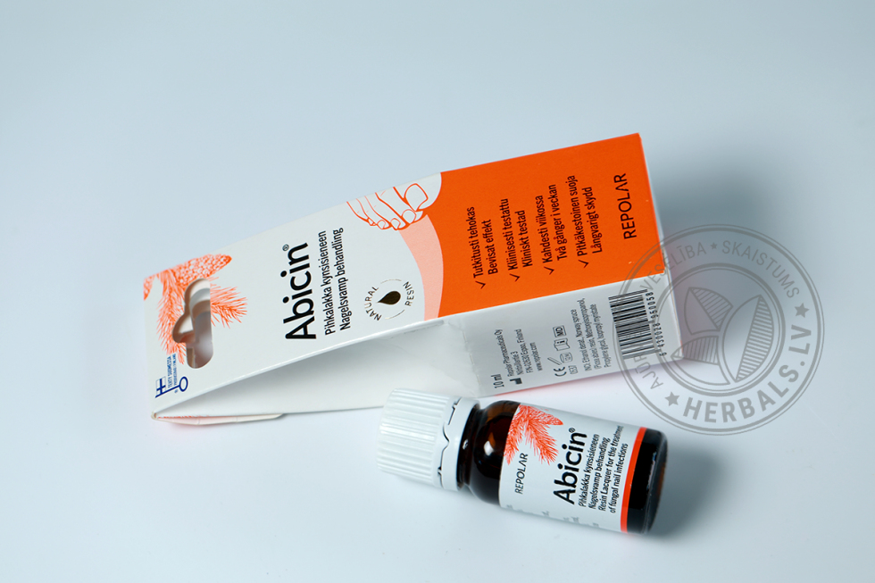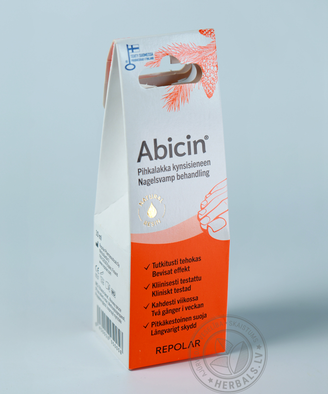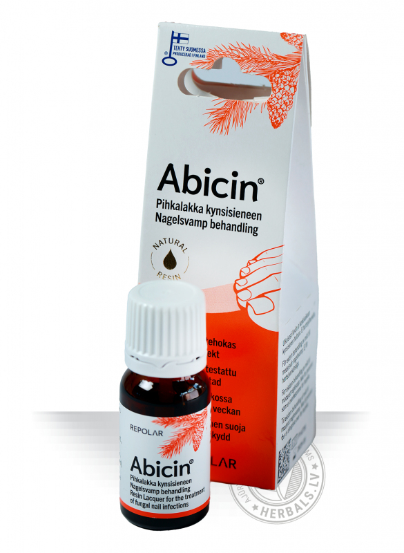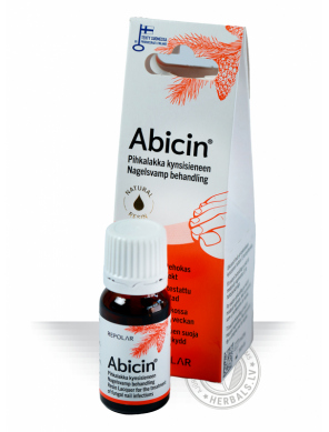 Лак для ногтей Abicin применяется при грибковых поражения ногтей, ножном грибке и воспалении ногтевого валика . Эффективность воздействия основана на свойствах веществ, обнаруженных в еловой живице лапландской ели обыкновенной (Picea abies), обладающих сильным противомикробным действием и оказывающих эффективное положительное воздействие на заживление ран и восстановление кожи. Применяя лак Abicin, происходит следующее: устраняется грибковые воспалительные бактерии, усиливается иммунитет кожи – средство обеспечивает механизмом борьбы с грибком и способствует регенерации поврежденной ткани. В результате грибок больше не будет образовываться.