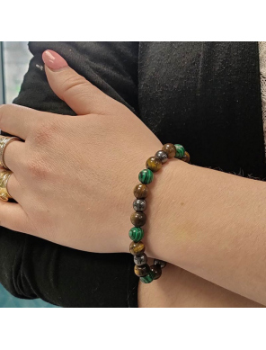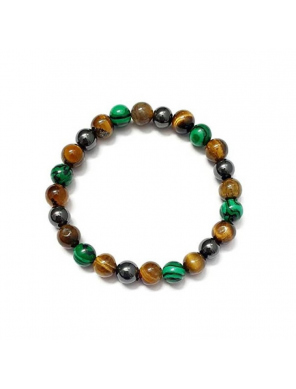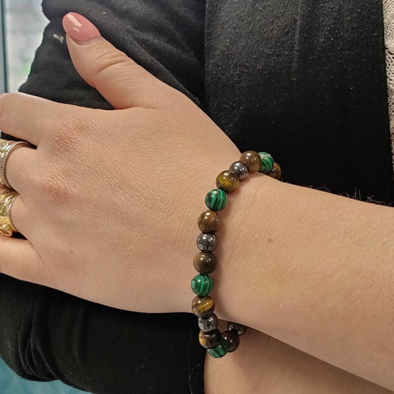 Браслет Lithotherapy и его натуральные камни оживят вашу физическую и умственную энергию. Этот браслет, состоящий из бусин малахита, гематита и тигрового глаза, способствует исцелению, творчеству и хорошему взаимопониманию с окружающими.