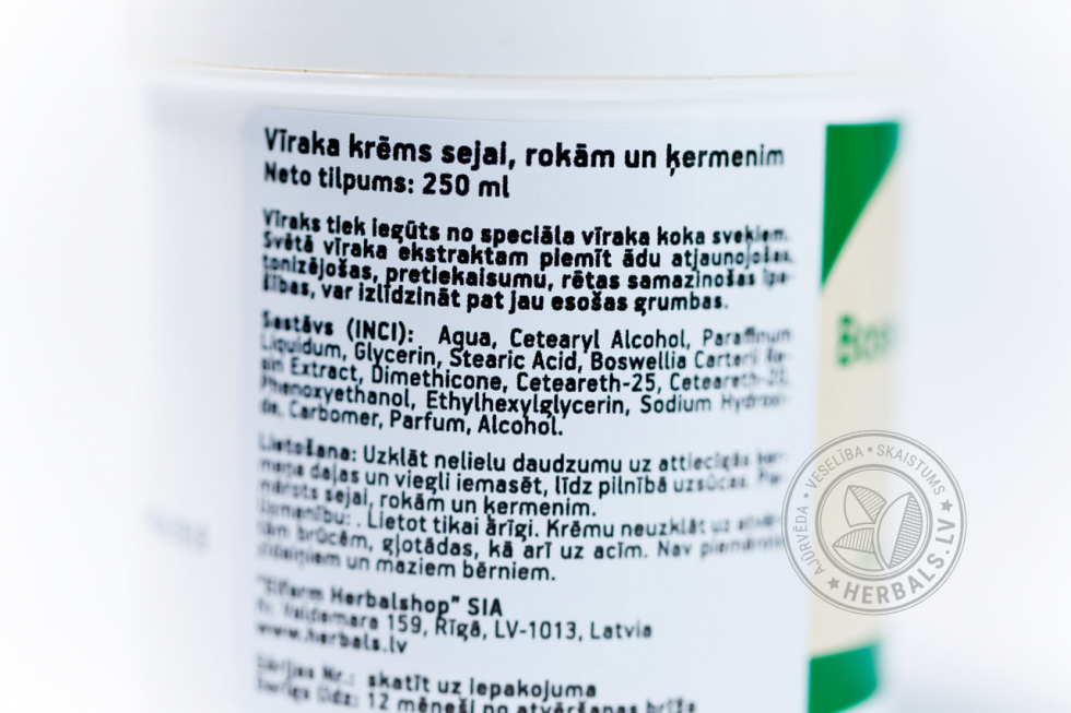 Ладан – растительная смола, выделяемая ладанными деревьями. Благодаря ладану в составе, крем обладает регенерирующими, противовоспалительными и увлажняющими свойствами. Ускоряет процессы микроциркуляции в коже, улучшает трофику тканей. Кожа становится более плотная и увлажнённая.