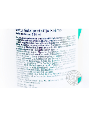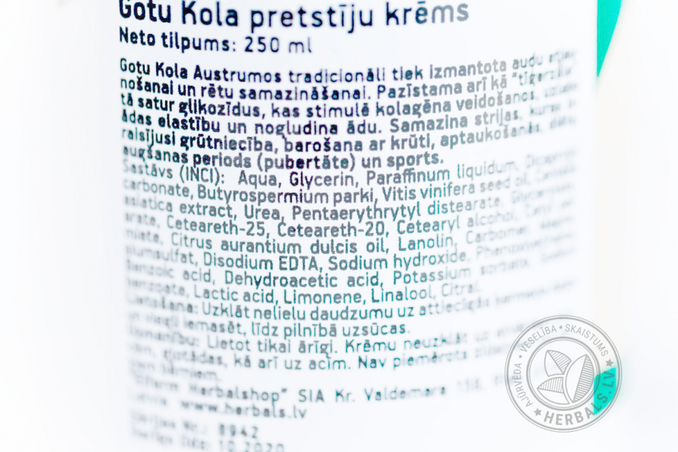 Состав: Aqua, Glycerin, Paraffinum liquidum, Dicaprylyl carbonate, Butyrospermium parki, Vitis vinifera seed oil, Centella asiatica extract, Urea, Pentaerythrytyl distearate, Glycerylstearate, Ceteareth-25, Ceteareth-20, Cetearyl alcohol, Cetyl palmiate, Citrus aurantium dulcis oil, Lanolin, Carbomer, Magnesiumsulfat, Disodium EDTA, Sodium hydroxide, Phenoxiyethanol, Benzoic acid, Dehydroacetic acid, Potassium sorbate, Sodium benzoate, Lactic acid, Limonene, Linalool, Citral.