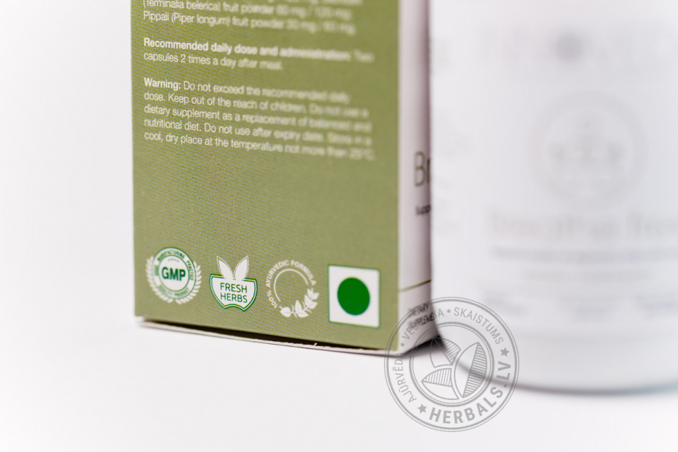 В 2-ух капсулах/ в 4-ёх капсулах: Порошок корня девясила (пушкарамулы) (Inula helenium L.) 500мг/ 1000мг; порошок листьев священного базилика (Ocimum basilicum L.) 60мг/ 120мг, порошок плодов бибхитаки (Terminalia bellirica) 60мг/ 120мг, порошок плодов длинного перца (Piper longum) 30мг/ 60мг; оболочка капсулы: растительная целлюлоза (E460);