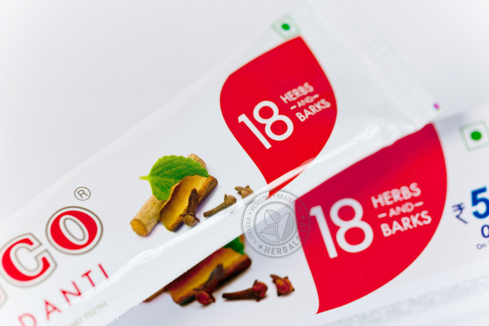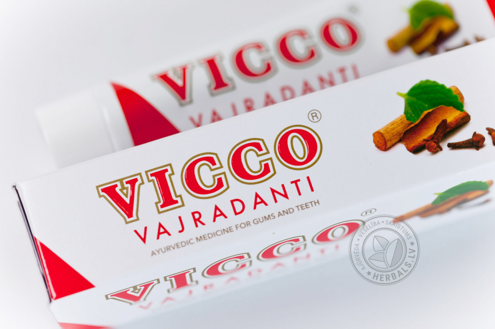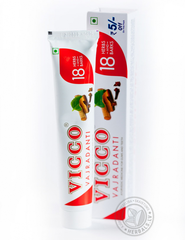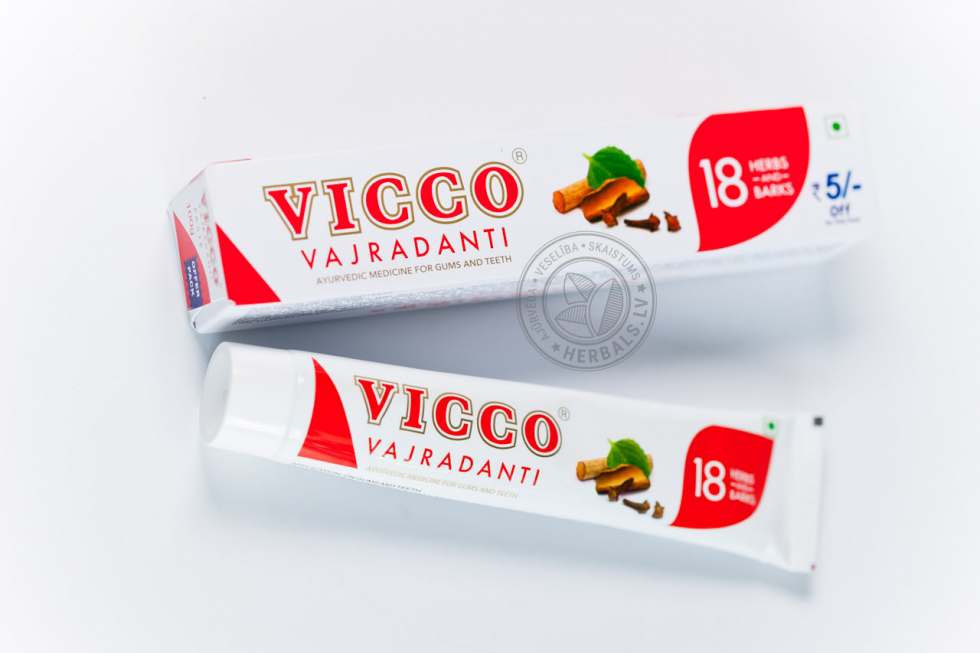 Паста VICCO содержит экстракты и эфирные масла целого ряда лечебных растений, среди которых: ажгон, акация аравийская, акация катеху, аккал-кхада, гвоздика, грецкий орех, зизифус настоящий, индийская смородина, кора деревьев и кустарников (дуба, индийской ежевики, кофейного дерева, мушмула), корень сарспариль, корица, лаванга, машжишта, перец кубеба, солодка, трипхала, финик уюба и цезальпиния.